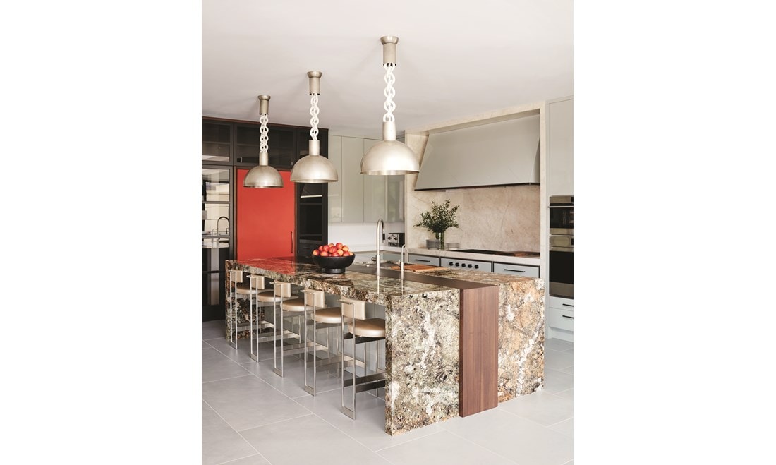 The dramatic stone for the 18-foot fireplace wall in the double-height living room is Southern Cross onyx.